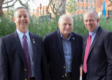 左起:James C.Wyant光學(xué)科學(xué)學(xué)院現(xiàn)任院長(zhǎng)Thomas Koch、James C.Wynt教授和亞利桑那大學(xué)校長(zhǎng)Robert C.Robbins
